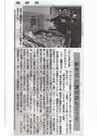 北海道新聞 平成23年11月10日の朝刊にて、 「鮮魚店 介護相談もどうぞ」と言った内容で 掲載されました。画像クリックで内容が見られます